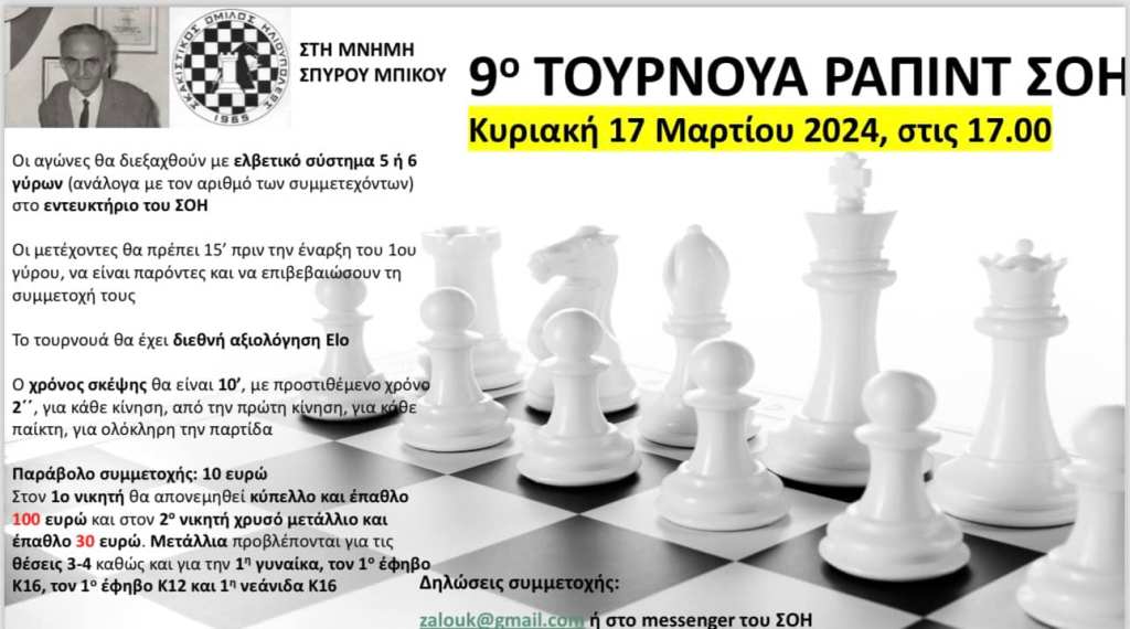 Ο Σκακιστικός Όμιλος Ηλιούπολης, προκηρύσσει τουρνουά Rapid στη μνήμη του Σπύρου Μπίκου με διεθνή αξιολόγηση, με την ονομασία «9o τουρνουά Rapid στη μνήμη Σπύρου Μπίκου».