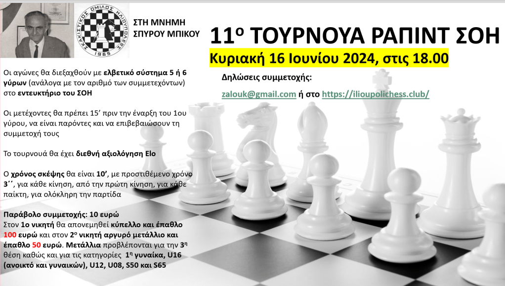 Ο Σκακιστικός Όμιλος Ηλιούπολης, προκηρύσσει τουρνουά Rapid στη μνήμη του Σπύρου Μπίκου με διεθνή αξιολόγηση, με την ονομασία «11Ο τουρνουά Rapid στη μνήμη Σπύρου Μπίκου». Το τουρνουά θα είναι Ελβετικό 5 ή 6 γύρων, ανάλογα με τον αριθμό συμμετεχόντων.