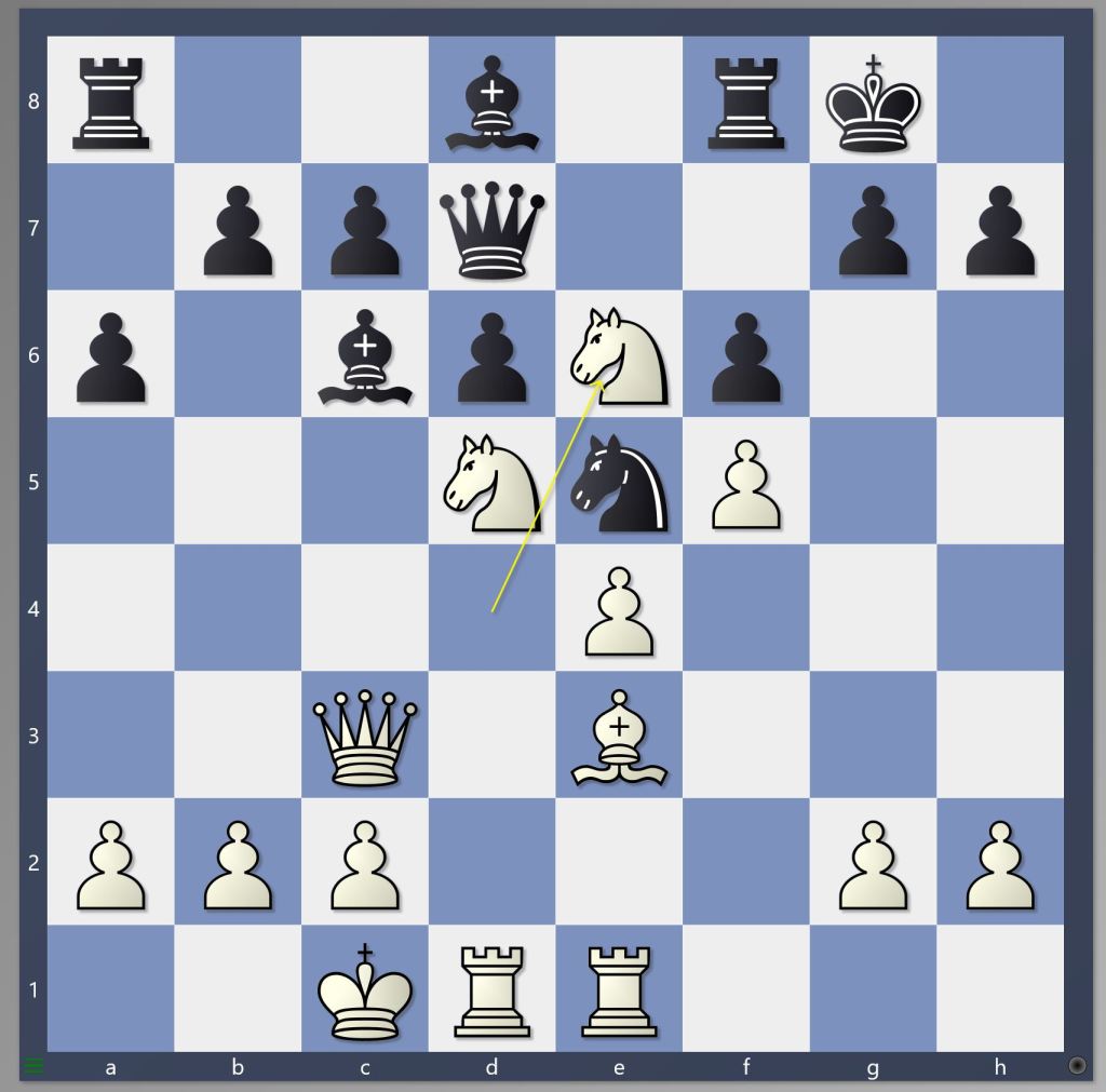 H βασίλισσα εγκαταλείπει την πολύ ισχυρή θέση της για να παραχωρήσει το τετράγωνο δ4 στον ίππο του ζ3, συνεχίζοντας να πιέζει παράλληλα στη διαγώνιο γ3-η7. Το σχέδιο του λευκού είναι να εκμεταλλευθεί το πλεονέκτημα χώρου που έχει με κινήσεις όπως Ιδ4, ζ4-ζ5 και έλεγχο του τετραγώνου ε6.