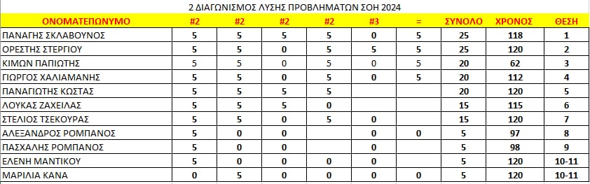 Με μεγάλη επιτυχία έγινε στο εντευκτήριο του ΣΟΗ, το απόγευμα της 6ης Σεπτεμβρίου 2024, ο 2ος διαγωνισμός επίλυσης σκακιστικών προβλημάτων. Οι συμμετέχοντες ήταν 11 και για πολλούς από αυτούς ήταν μια θαυμάσια ευκαιρία να έρθουν για πρώτη φορά σε επαφή με τον κόσμο των σκακιστικών προβλημάτων.