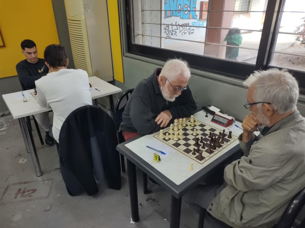Ο Άγγελος Κασάπογλου, με τα μαύρα κομμάτια, στην 1η του παρτίδα με την ομάδα Κ12. Ένας εξαιρετικός νεαρός μας παίκτης που σίγουρα έχει να προσφέρει πολλά στις διασυλλογικές διοργανώσεις. Στο βάθος ο Αλέξανδρος Ρομπάνος σε μια από τις αγαπημένες του βόλτες περιμένοντας την κίνηση του αντιπάλου του