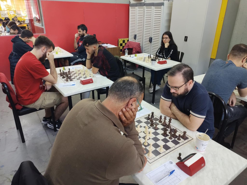 Ο Στέλιος Τσεκούρας με τα λευκά, στο μέσο της φωτογραφίας, στην 1η σκακιέρα της ομάδας μας στο Κύπελλο Δρεπανιώτη στη συνάντηση με τον Πάολο-Μαρία Κοντσέττι