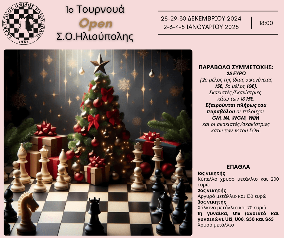 Ο Σκακιστικός Όμιλος Ηλιούπολης, προκηρύσσει τουρνουά Open με εθνική και διεθνή αξιολόγηση, με την ονομασία «1ο Tουρνουά Open Σ.Ο.Ηλιούπολης».