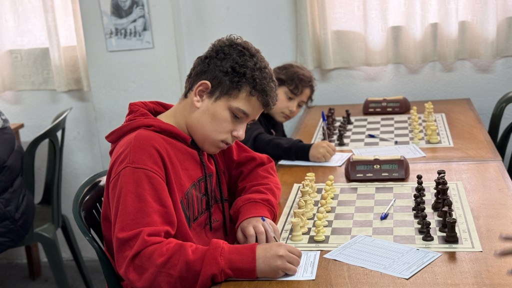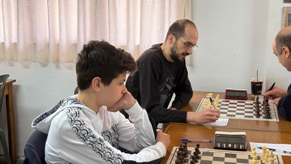 Ο Φοίβος Καμπίτσης ετοιμάζεται για την 1η κίνηση στη νικηφόρα παρτίδα του. Δίπλα του η αδελφή του Ύρια, που έπαιξε πολύ όμορφα και έφτασε και αυτή σε μια πολύτιμη νίκη