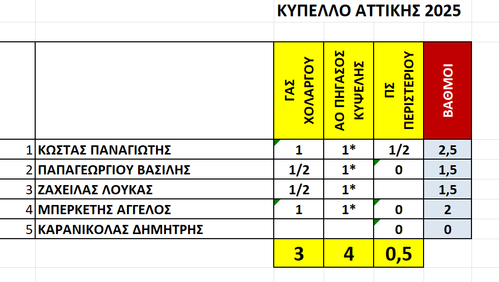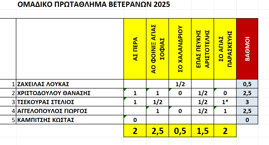 Στο Ομαδικό Πρωτάθλημα Βετεράνων 2025 είχαμε την καλύτερη παρουσία της ομάδας μας στις διασυλλογικές διοργανώσεις. Με 3 νίκες, 1 ήττα και 1 ισοπαλία η ομάδα μας κατετάγη 4η επί 21 ομάδων. Οι προοπτικές σε αυτή την κατηγορία είναι εξαιρετικές, δεδομένου ότι ισχυροί παίκτες της ομάδας των βετεράνων στελέχωσαν την ομάδα που αγωνίστηκε στο Κύπελλο Αττικής.