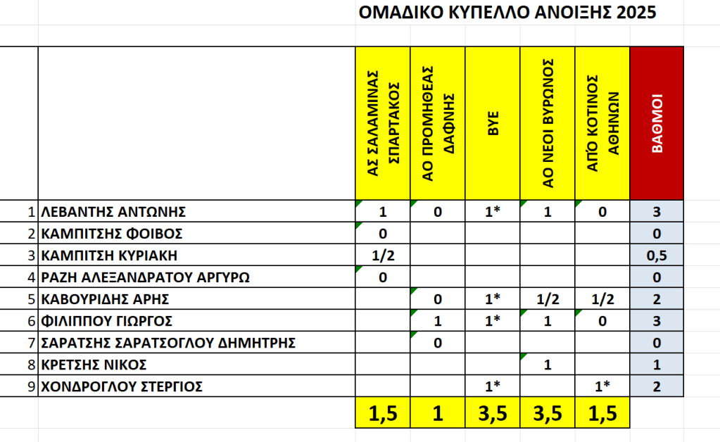 Στο Ομαδικό Κύπελλο Άνοιξης, έχουμε πάντα τη δυνατότητα να δοκιμάζουμε αρκετούς παίκτες. Έτσι και φέτος 9 διαφορετικοί αθλητές μας αγωνίστηκαν και η ομάδα με 2 νίκες και 3 ήττες βρέθηκε στην 15η θέση της γενικής βαθμολογίας επί 23 ομάδων.