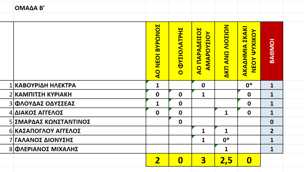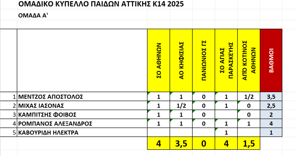 Όλα τα παιδιά έδωσαν τον καλύτερο εαυτό τους και τις κορυφαίες επιδόσεις σημείωσαν ο 9 χρονος Αλέξανδρος Ρομπάνος (4/5) και ο 13χρονος Απόστολος Μέντζος (3,5/5). Μόνο θετικά μηνύματα μένουν από την εξαιρετική πορεία της ομάδας.
