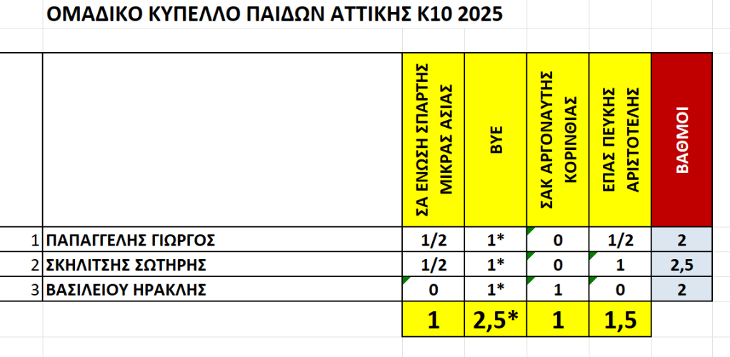 Τέλος στο Ομαδικό Κύπελλο Παίδων Αττικής Κ10 η ομάδα μας με αρκετές απουσίες περιορίστηκε σε 1 νίκη, 1 ισοπαλία και 3 ήττες (1 άνευ αγώνος) με αποτέλεσμα να τερματίσει στην 25η θέση της βαθμολογίας ανάμεσα σε 27 ομάδες.