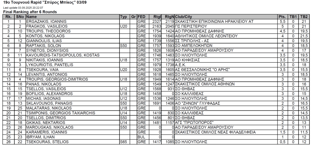Την Τετάρτη 3/9/2025, το 19ο τουρνουά ράπιντ του Σκακιστικού Ομίλου Ηλιούπολης για μια ακόμα φορά συγκέντρωσε αρκετούς ισχυρούς σκακιστές. Νικητής με 5,5 βαθμούς σε 6 αγώνες ο Γιάννης Εργαζάκης. Στην δεύτερη θέση με 5 βαθμούς βρέθηκε ο Βασίλης Φράγκος, ενώ στην 3η ο Θεόδωρος Τρουπής.