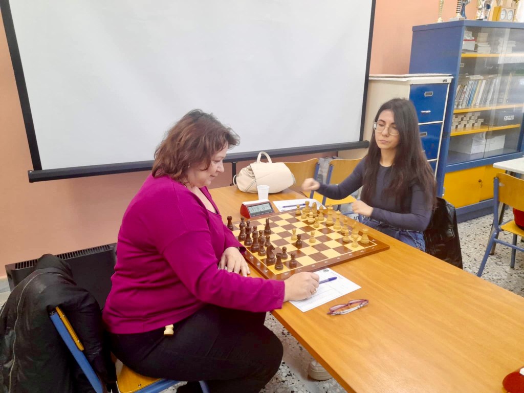 Συναρπαστική παρτίδα είχαμε ανάμεσα στη Μαρία Μαστοράκου (αριστερά) και την Ανδριάννα Αναστασοπούλου που τελικά επικράτησε και έδωσε τον βαθμό στην ομάδα μας. Ενδιαφέρον σημείο ότι η Μαρία έπαιζε την ομάδα μας τη δεκαετία του ’90 στη σκακιέρα των νεανίδων