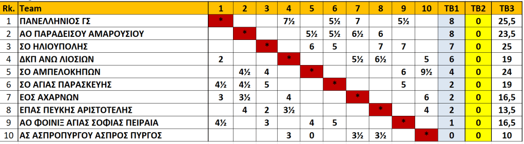 Παρά το σκορ η συνάντηση ήταν πολύ δυνατή και με αρκετή αγωνία μέχρι τη διαμόρφωση του τελικού αποτελέσματος. Αναλυτικά είχαμε 1) ΚΑΡΑΓΙΑΝΝΗΣ ΑΘΑΝΑΣΙΟΣ-ΚΩΣΤΑΣ ΠΑΝΑΓΙΩΤΗΣ=0-1, 2) ΑΛΕΞΑΚΗΣ ΔΗΜΗΤΡΙΟΣ-ΤΣΑΓΚΑΡΟΠΟΥΛΟΣ ΣΠΥΡΙΔΩΝ=½-½, 3) ΛΥΡΑΚΗΣ ΣΤΑΥΡΟΣ-ΚΑΡΑΝΙΚΟΛΑΣ ΔΗΜΗΤΡΙΟΣ=½-½, 4) ΓΕΩΡΓΑΚΟΠΟΥΛΟΣ ΒΑΣΙΛΕΙΟΣ-ΠΑΠΑΓΕΩΡΓΙΟΥ ΒΑΣΙΛΕΙΟΣ=0-1, 5) ΣΚΛΑΒΟΥΝΟΣ ΠΑΝΑΓΙΩΤΗΣ-ΤΣΙΦΕΤΑΚΗΣ ΠΑΝΑΓΙΩΤΗΣ=1-0, 6) ΜΑΣΤΟΡΑΚΟΥ ΜΑΡΙΑ-ΑΝΑΣΤΑΣΟΠΟΥΛΟΥ ΑΝΔΡΙΑΝΝΑ=0-1, 7) ΤΣΙΜΠΛΙΔΗ ΧΑΡΙΚΛΕΙΑ-ΚΑΜΠΙΤΣΗ ΚΥΡΙΑΚΗ=0-1, 8) ΦΛΩΡΟΣ ΣΠΥΡΙΔΩΝ-ΚΑΜΠΙΤΣΗΣ ΦΟΙΒΟΣ=½-½ , 9) ΤΑΛΑΒΕΡΟΥ ΒΑΣΙΛΙΚΗΒΙΚΤΩΡΙΑ-ΜΙΧΑΣ ΙΑΣΟΝΑΣ=½-½, 10) ΚΑΛΙΚΑΤΖΑΡΟΣ ΒΑΣΙΛΕΙΟΣ-ΡΟΜΠΑΝΟΣ ΑΛΕΞΑΝΔΡΟΣ=0-1.