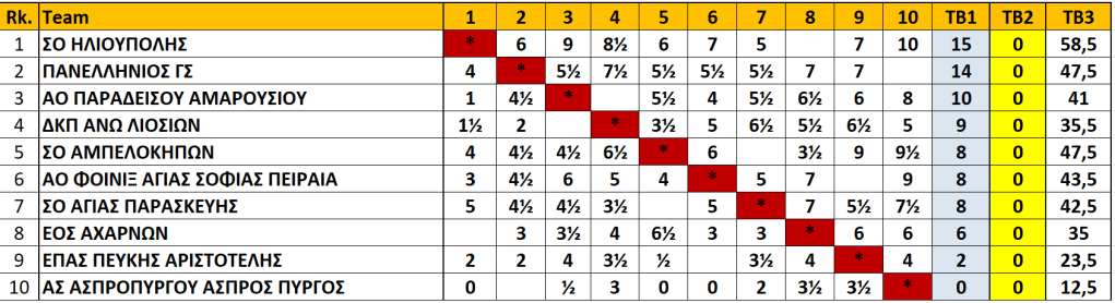 Τα αναλυτικά αποτελέσματα ήταν: 1) ΚΩΣΤΑΣ ΠΑΝΑΓΙΩΤΗΣ-ΚΟΡΡΕΣ ΕΥΑΓΓΕΛΟΣ=1-0, 2) ΤΣΑΓΚΑΡΟΠΟΥΛΟΣ ΣΠΥΡΙΔΩΝ-ΓΑΛΑΝΟΠΟΥΛΟΣ ΕΥΦΡΑΙΜ=½-½, 3) ΚΑΡΑΝΙΚΟΛΑΣ ΔΗΜΗΤΡΙΟΣ-ΒΑΘΗΣ ΙΣΙΔΩΡΟΣ=1-0, 4) ΠΑΠΑΓΕΩΡΓΙΟΥ ΒΑΣΙΛΕΙΟΣ-ΣΙΜΟΥ ΣΤΥΛΙΑΝΟΣ=1-0, 5) ΚΑΠΟΝΗΣ ΙΩΑΝΝΗΣ-ΑΡΓΥΡΟΠΟΥΛΟΣ ΓΕΩΡΓΙΟΣ=1-0, 6) ΑΝΑΣΤΑΣΟΠΟΥΛΟΥ ΑΝΔΡΙΑΝΝΑ-ΜΟΥΡΤΖΟΥΝΗ ΜΑΡΙΑ=1-0, 7) ΚΑΜΠΙΤΣΗ ΚΥΡΙΑΚΗ-ΜΠΟΥΜΠΟΥΡΙΔΟΥ ΟΛΓΑ=1-0, 8) ΦΙΛΙΠΠΟΥ ΓΕΩΡΓΙΟΣ-ΜΙΧΑΗΛ ΚΩΝΣΤΑΝΤΙΝΟΣ=0-1, 9) ΜΙΧΑΣ ΙΑΣΟΝΑΣ-ΛΙΟΣΗΣ ΜΙΧΑΗΛ=1-0, 10) ΡΟΜΠΑΝΟΣ ΑΛΕΞΑΝΔΡΟΣ-ΣΙΜΟΥ ΑΓΓΕΛΟΣ=1-0.